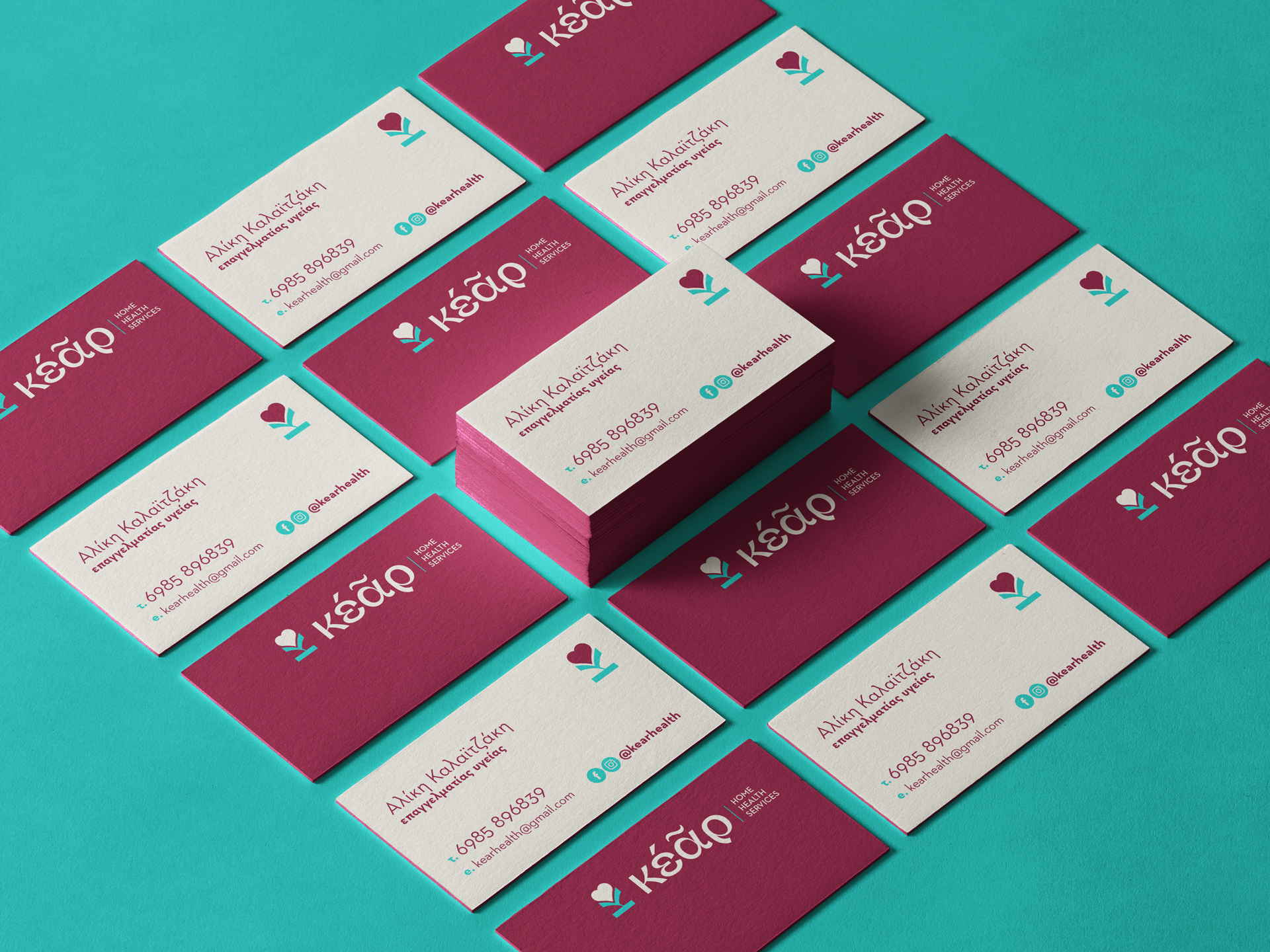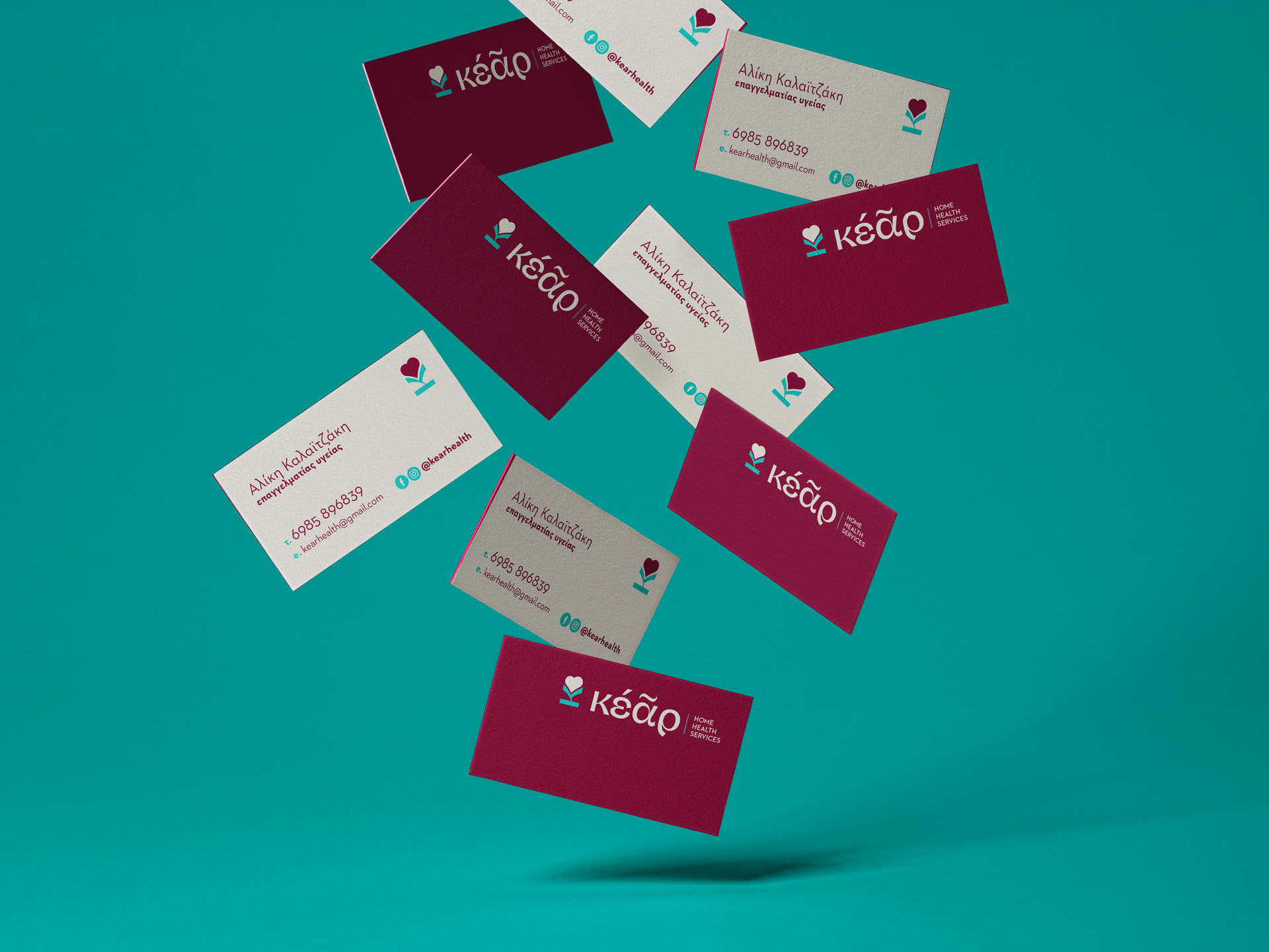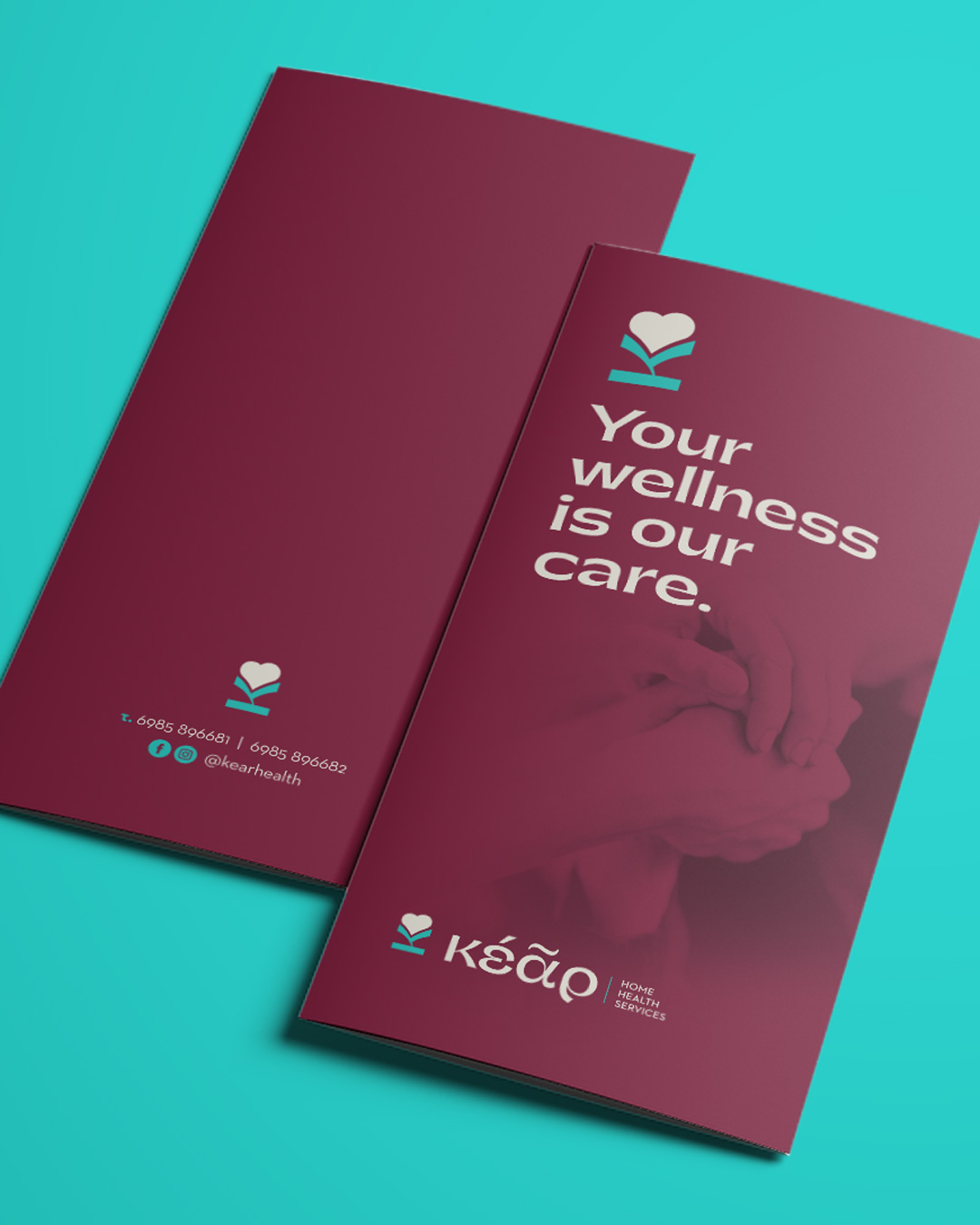 We designed the brand identity for KEAR, a home health service offering support and expert medical attention to elderly and people with disabilities. Inspired by the ancient Greek word kêr (heart) and echoing the sound of care, the name guided the entire concept.