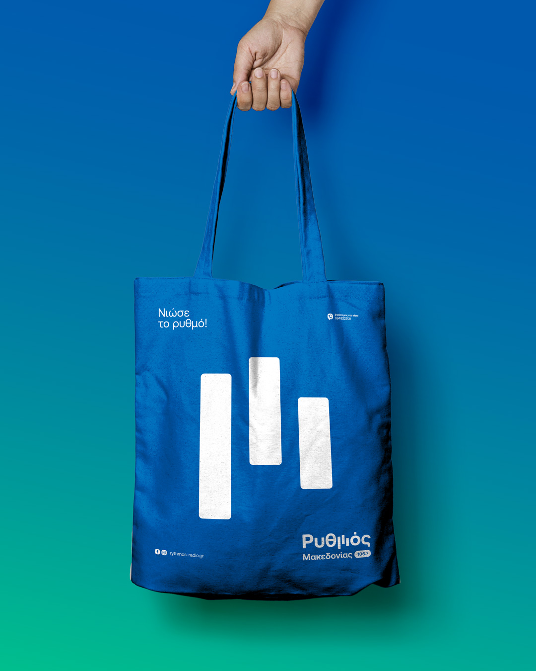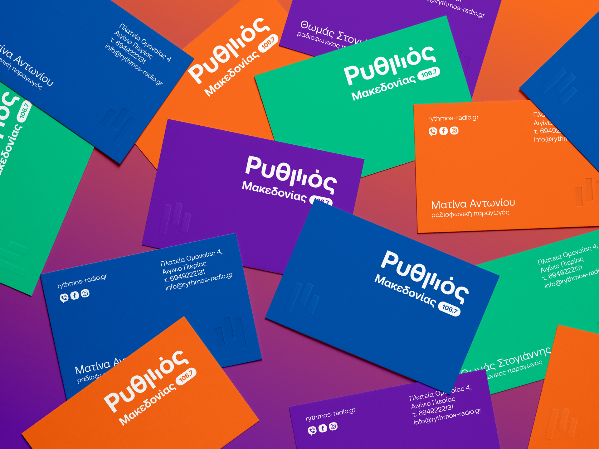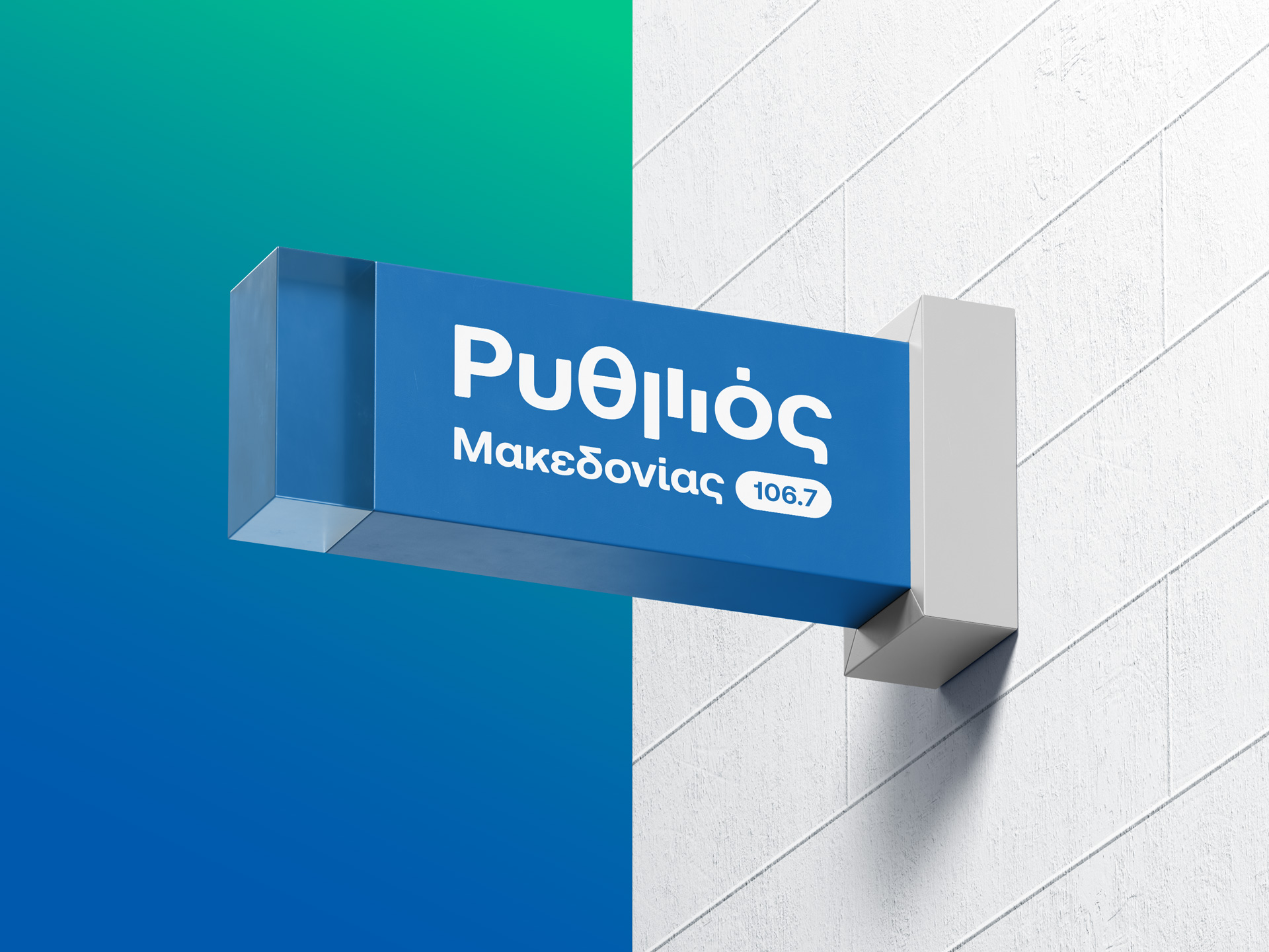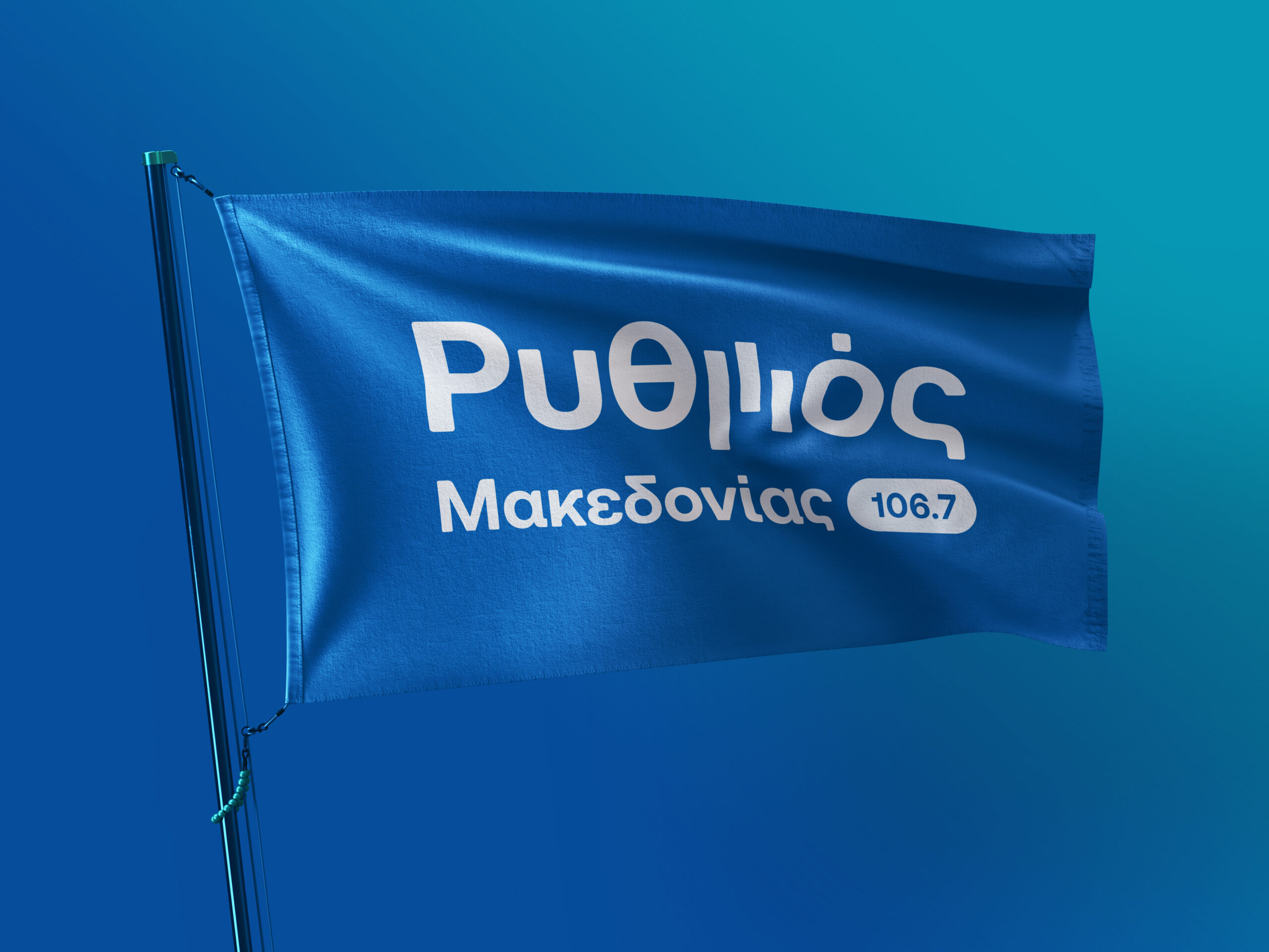 Brand identity design for a new voice on the airwaves, an FM radio station broadcasting from central Macedonia region, carrying the pulse of greek music. Inspired by sound and movement, the logo brings “Ρυθμός” (Rhythm) to life, capturing the flow of music and emotion. The letter μ transforms into a dynamic linear symbol that echoes sound equalizer lines and console faders, with vivid colors blending like melodies, creating a fresh feel that reflects the station’s vibrant energy and contemporary spirit.