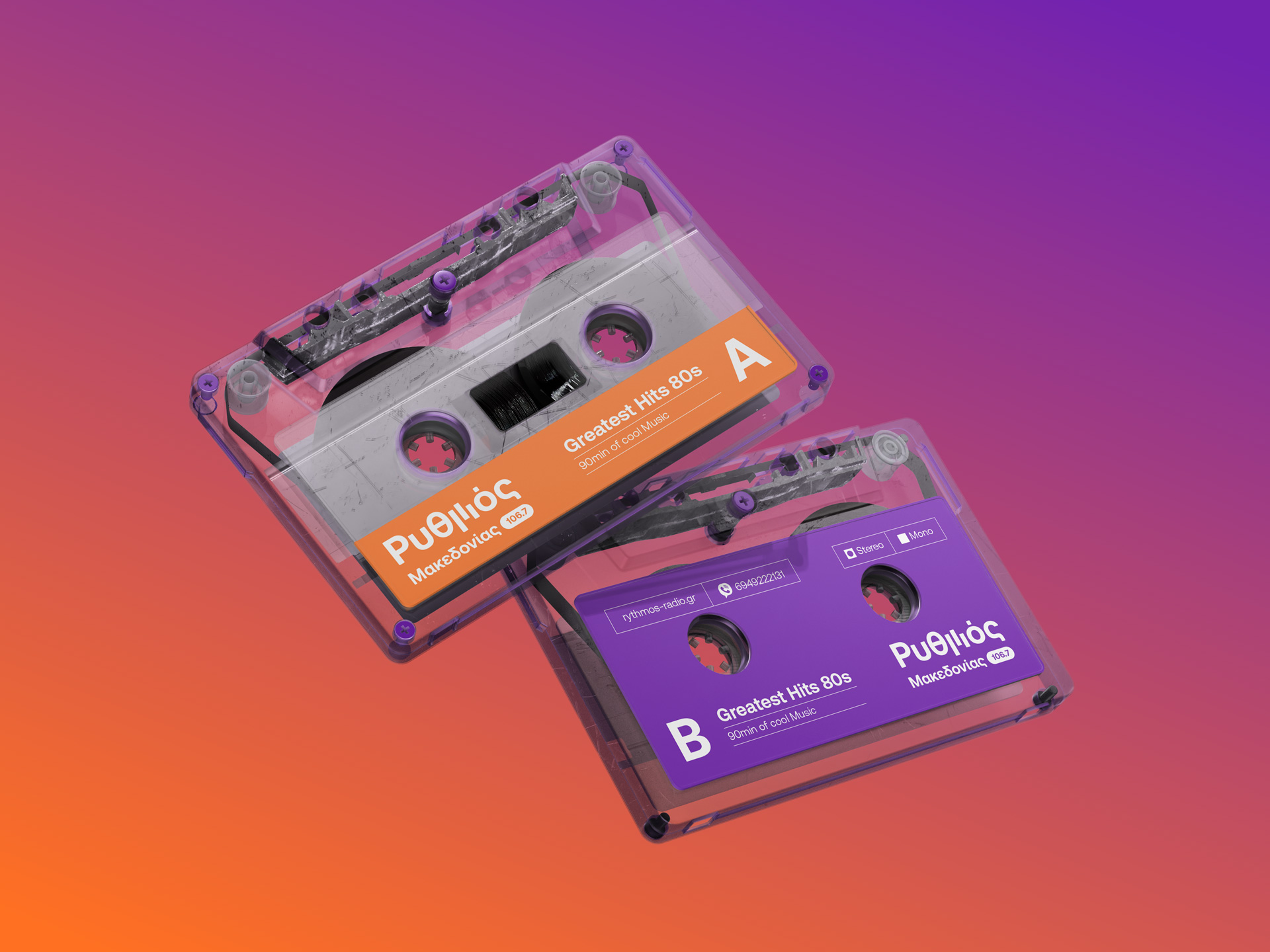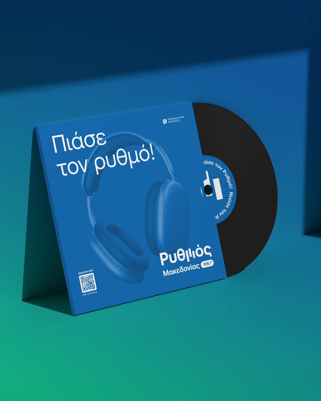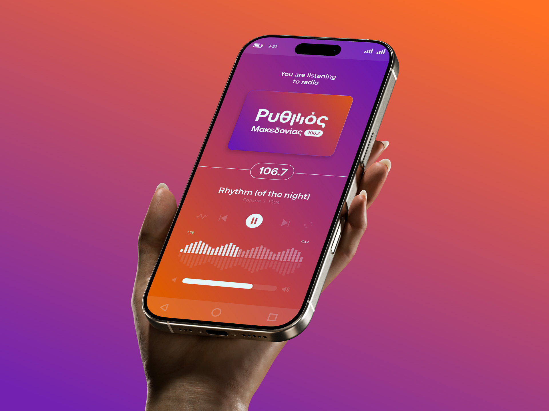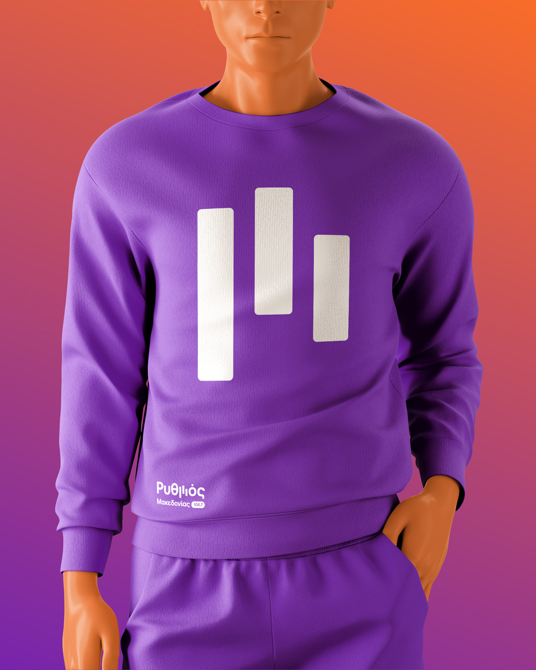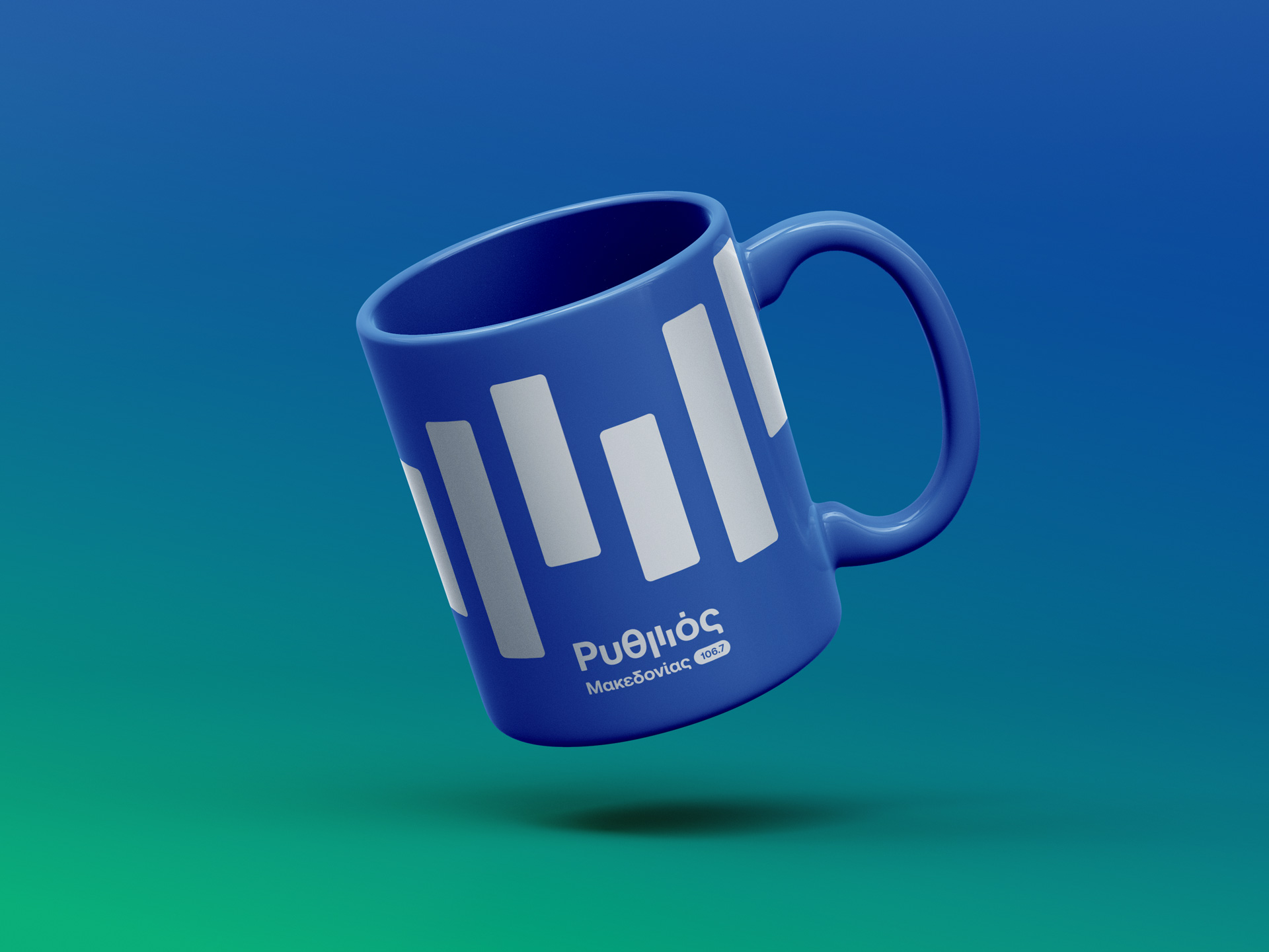 Brand identity design for a new voice on the airwaves, an FM radio station broadcasting from central Macedonia region, carrying the pulse of greek music. Inspired by sound and movement, the logo brings “Ρυθμός” (Rhythm) to life, capturing the flow of music and emotion. The letter μ transforms into a dynamic linear symbol that echoes sound equalizer lines and console faders, with vivid colors blending like melodies, creating a fresh feel that reflects the station’s vibrant energy and contemporary spirit.